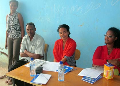 Hirut (lærer), Eshatu (prosjektleder), Asrat( lærer) og Mahader regnskap). Her har de akkurat registrert og delt ut materiell til ca 100 lærere som deltar på et av seminarene som har vært arrangert.