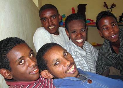 Flere gode venner. Før prosjektet startet kjente ikke noen av disse guttene hverandre. De møttes på senteret og vennskap ble knyttet. Zacarias helt til høyre i bildet skal nå til Addis for å få operert bort svultsen ved øyet som har påvirket synet hans.